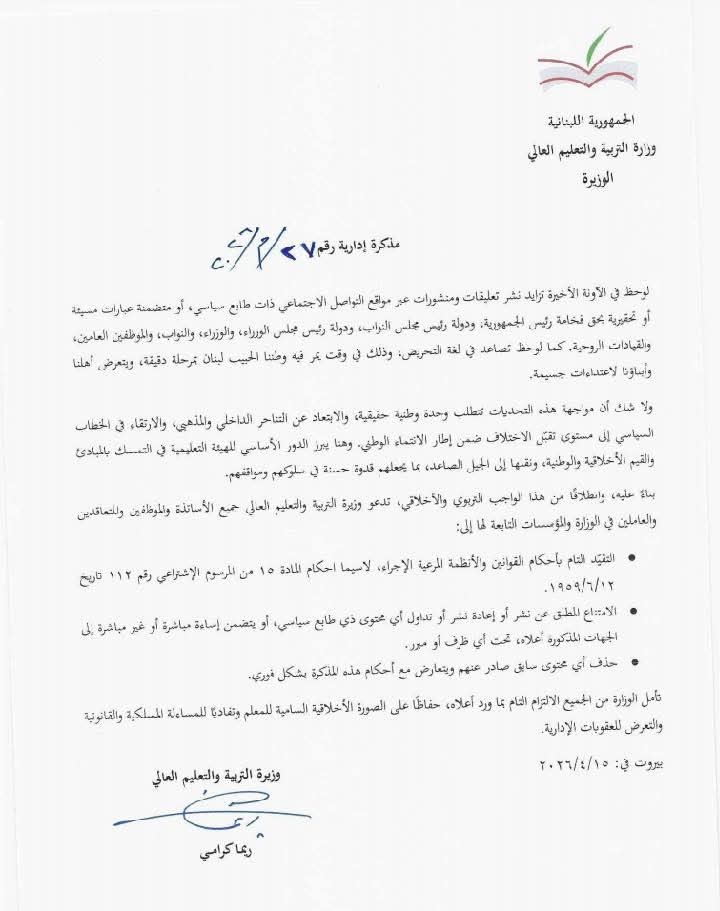 أصدرت وزيرة التربية قراراً يمنع الأساتذة من نشر آرائهم السياسية، مما فجر موجة من الانتقادات حول حريّة التعبير.